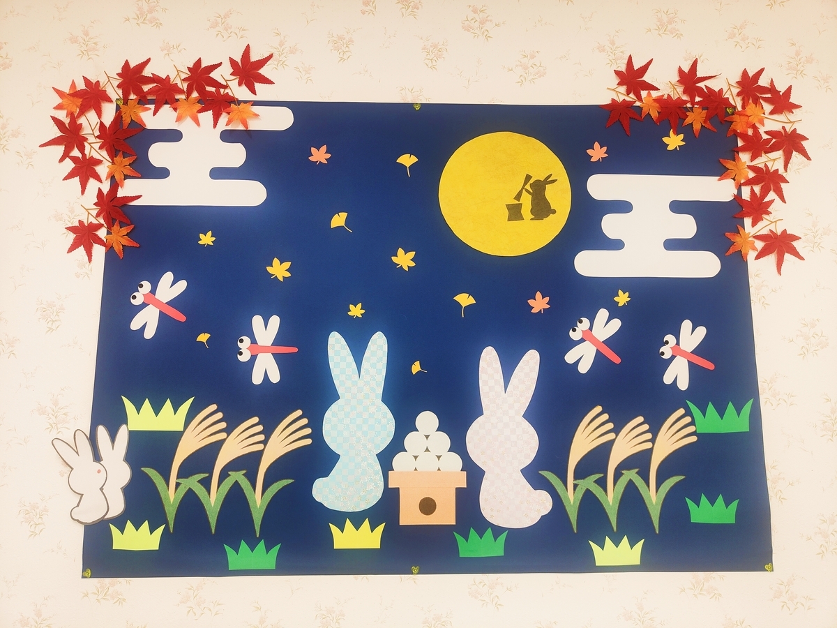 月やうさぎを貼り付けてきれいなお月見飾りが完成✨